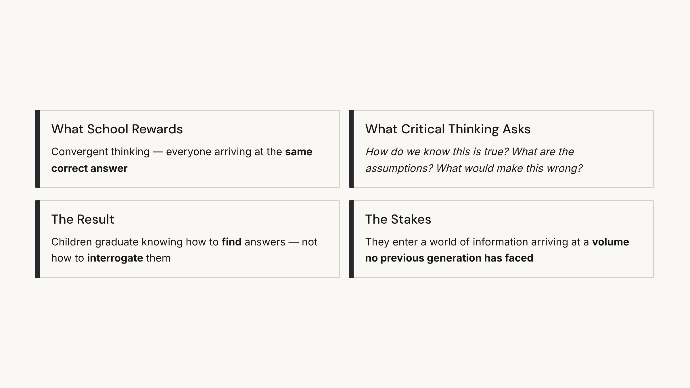 School, as it’s currently structured, is extraordinarily good at teaching children to process and reproduce information. Read this. Understand it. Show us you understood it. Repeat. The system rewards students who can accurately return what they were given — and that’s not a criticism of teachers, most of whom would love to teach differently. It’s a structural reality. When you’re covering a curriculum and assessing thirty students against standardised benchmarks, convergent thinking — everyone arriving at the same correct answer — is what the system is built for.