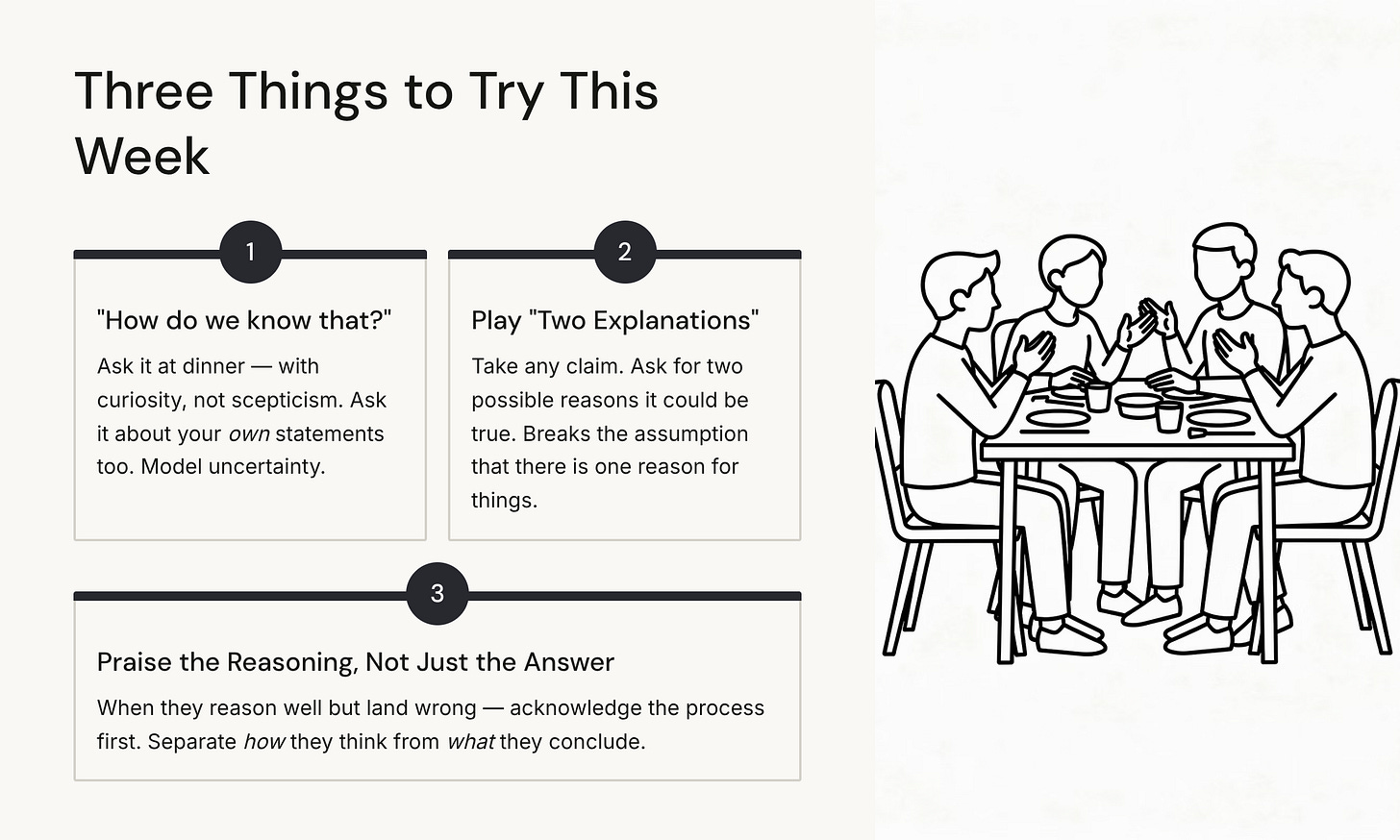 The entry point isn’t argument. It’s wonder. “Huh, I hadn’t thought about it that way. How did you get to that?” That single question, asked with genuine interest, does more for a child’s reasoning habits than an hour of structured debate. It signals that their thinking process is worth examining — not because it’s wrong, but because thinking is interesting.