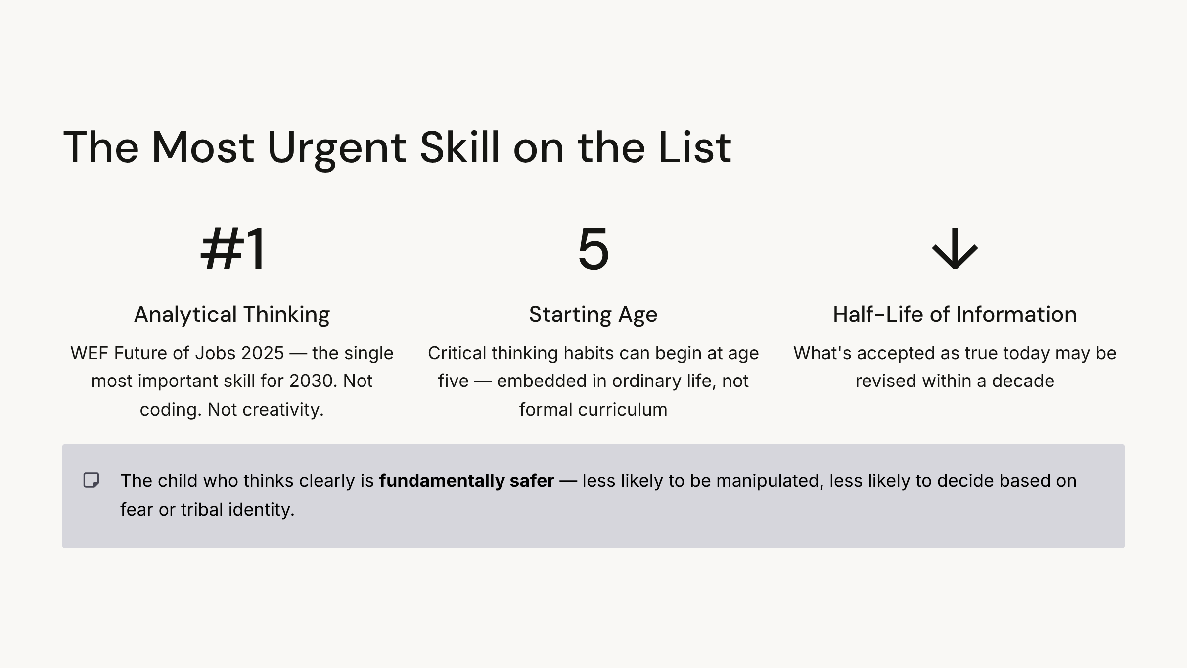 In that world, the child who can think clearly under pressure is not just academically better off. They are fundamentally safer. Less likely to be manipulated. Less likely to make decisions based on fear, tribal identity, or whoever spoke to them most recently. More likely to change their mind when the evidence actually warrants it — which is rarer than it sounds.