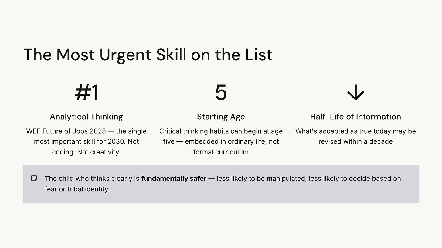Paid subscribers: Wednesday’s implementation guide goes deep on the Critical Thinking Framework — the four questions to use at every age, how to navigate the child who accepts everything they’re told, and a practical toolkit for building evidence-evaluation as a daily habit. Friday’s action plan gives you the complete system: age-by-age scripts, real-world scenarios to practise with, and a 30-day challenge built around the one skill the WEF says matters most.